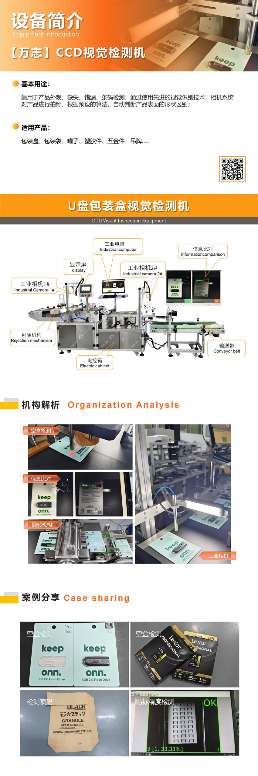 基本用途 適用于產品外觀、缺失、錯漏、條碼檢測;通過使用先進的視覺識別技術,相機系統對產品進行拍照,根據預設的算法,自動判斷產品表面的形狀區別; 萬志貼標機廠家根據客戶需求定制。