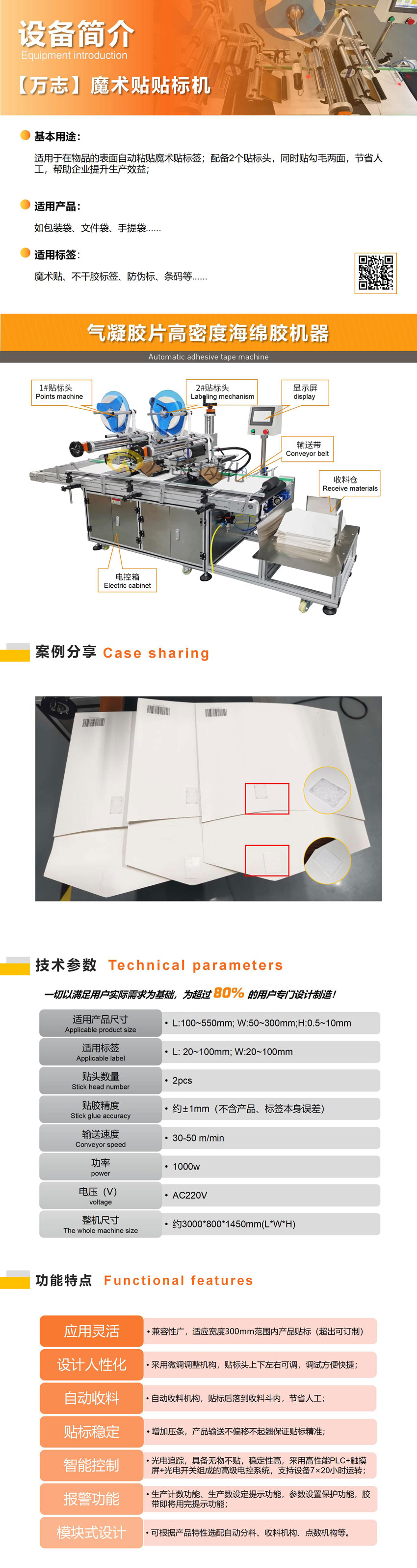 基本用途 包裝盒自動貼魔術(shù)貼標(biāo)簽機器適用于在包裝袋/盒或禮盒手提袋上自動粘貼魔術(shù)貼,勾毛兩面同時貼標(biāo);