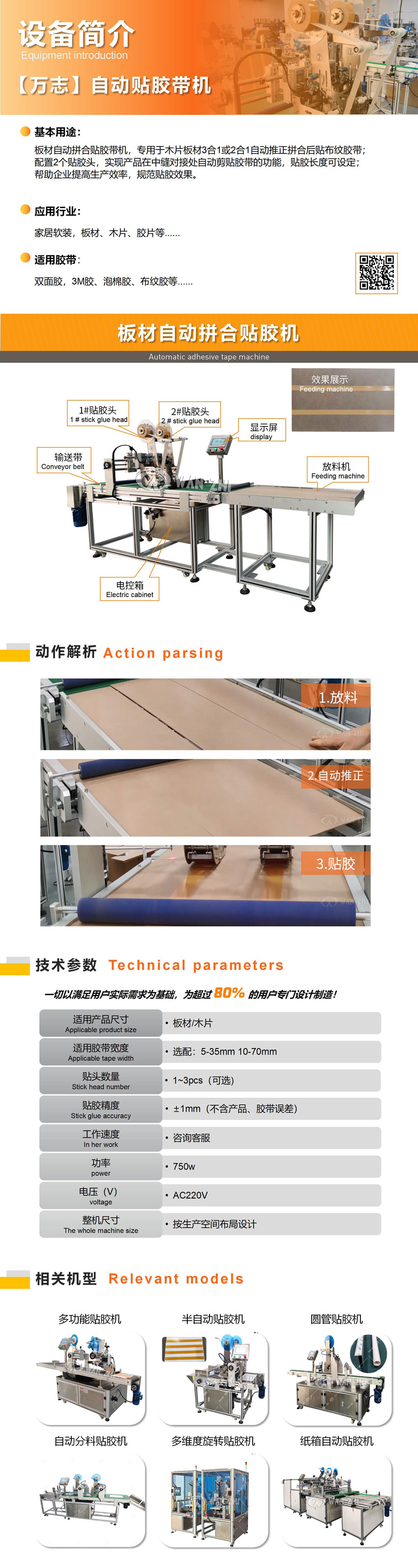 基本用途 木片自動拼合貼膠帶機專用于木片3合1自動拼合貼雙面膠帶;配置2個貼膠頭,實現產品在2個中縫自動剪貼膠帶的功能,長度可選;提高生產效率,規范貼膠效果。