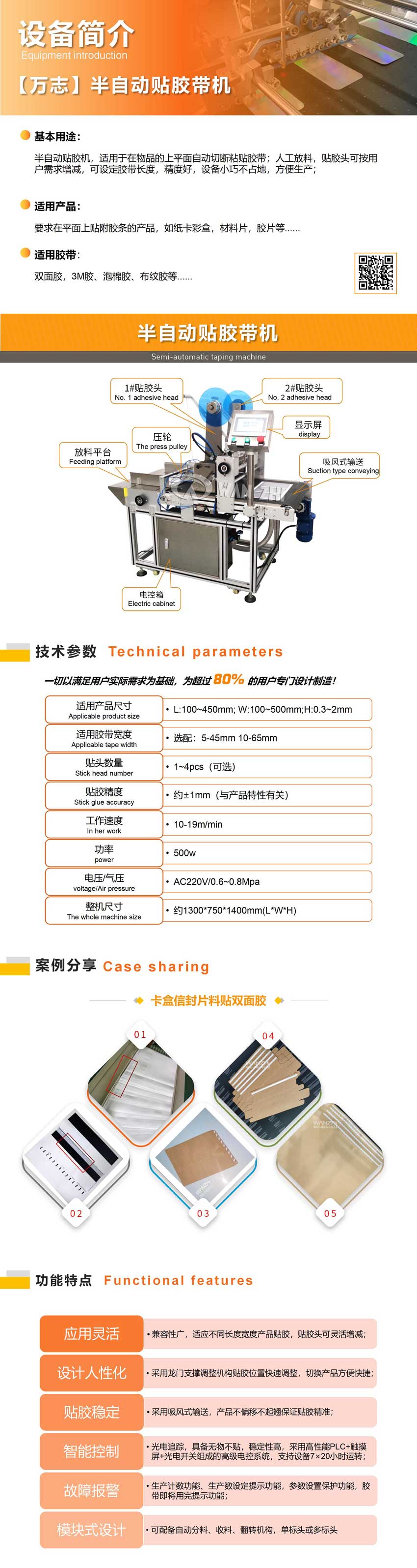 基本用途:自動貼雙面膠機適用于在各種物品的表面粘貼雙面膠帶;配置2個貼膠頭,膠帶長度可調,實現產品在2個不同位置貼膠帶的功能;如海報、紙盒、腰封等產品自動貼膠;20~280/150~500mm輸送寬度可眩