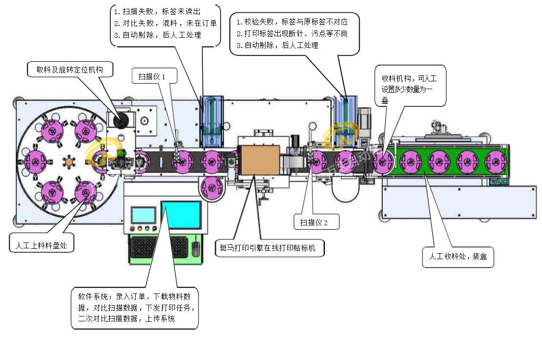 工位說明:1.判斷條件,讀取條碼不成功,物料混料,料盤不在當前設備的訂單中等