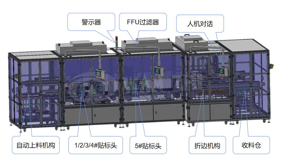 LED反射片貼標及壓合折邊機投放于無塵車間使用,設備采用ffu過濾設備,使外氣先通過MAU(外氣進行首次過濾)進入無塵室頂部,再通過FFU(二次過濾)將風送進無塵室內,送下來的風通過高架地板,再進入回風箱送到無塵室頂部, 風速調節靈活,潔凈區易于變更;